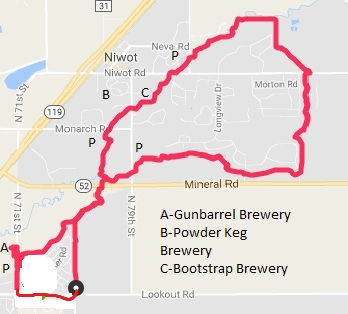 We take the Niwot loop trail to prehumously work off our beers. There are several trailheads (marked with a P) on the loop (see the map below) or come out the LoBo trail from either Boulder or Longmont. Also other breweries easily accessible off this trail as noted in the map. You'll find today's directions pretty lengthy because there are so many connecting trails in the area, great to explore.The trail is entirely crushed gravel and about 6 ft wide. Great for the kids or a burley or even a cross bike. We catch the trail from an access point in Gunbarrel and head north toward Niwot. Much of the trail follows the duel ditches coming from the res, so there is lots of big trees and vegetation. After crossing under Hwy 52 we take the right fork and head east. The trail crosses 79th street (to one of the trailheads) and over a couple of ditchs where we make another right to take on the hill. A shorter more scenic route can be had by going left! At the top of the hill, the trail crosses Somerset Drive and continues east. Eventually it loops around to the north around one of Niwot exquisite neighborhoods. Just as the trail starts to go west again take a right to continue north. You'll be rewarded with a big hill that ends on Niwot road. Look closely and slightly to the east and the trail continues behind Niwot High School. Stay next to the ditch unless you want to see their baseball field. After the school property the trail goes north again down another hill. At the bottom of the hill you'll finally go west. The trail rolls through a few neighborhoods and end up at the Lefthand Grange Park. We head south under Niwot Road and back over 79th street again. The trail forks, but stay along the ditch. The trail crosses another road but it's clear where to go. As you approach Hwy 52 again keep left over the ditch and complete the loop. However to get to Gunbarrel brewery you'll have to go under 52 via the under pass and up the hill, rejoining the twin ditches. Stay between them until the trail meets 71st street. Unfortunately 71st is getting a new bridge and is closed to cars, but not bikes. They even have a workaround to head north. You only have to go a couple of block to get to the Tech Center where Gunbarrel Brewery sit on the SW corner. Plenty of bike parking in front.